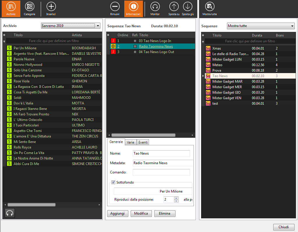 Créez des séquences de fichiers (par exemple, actualités, reportages, images avec fond musical) et programmez-les à des heures précises. Jingle d’entrée, fond musical, partie parlée, stinger, jingle de sortie : tout est entièrement automatisé.