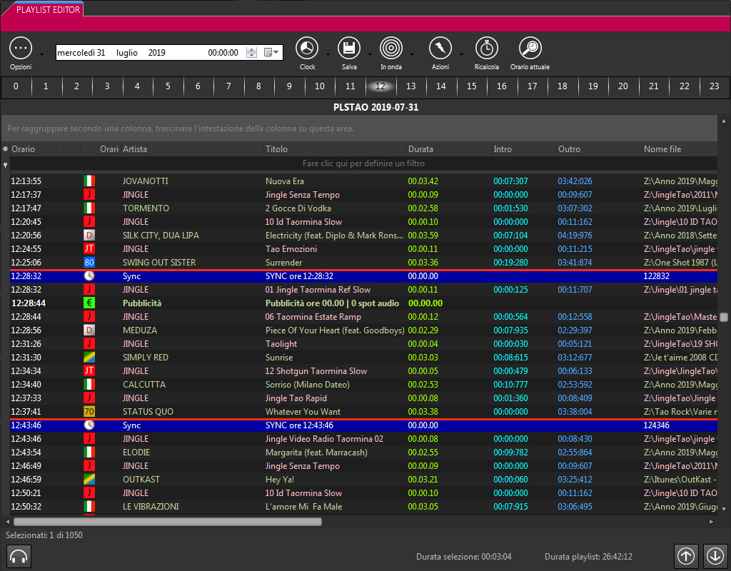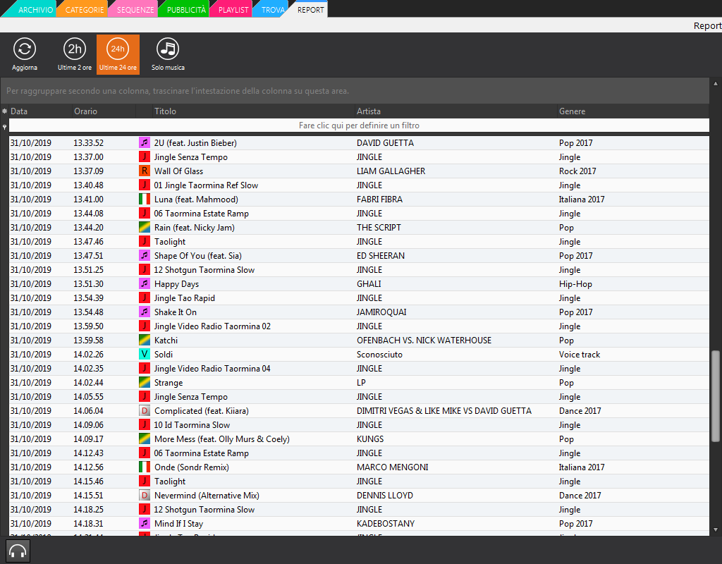 Une vue synthétique de ce qui a été diffusé au cours des dernières 24 heures (ou toute autre période personnalisée). Filtres par musique, promotions, émissions ou publicités — essentiels pour le contrôle qualité, la conformité et le reporting.